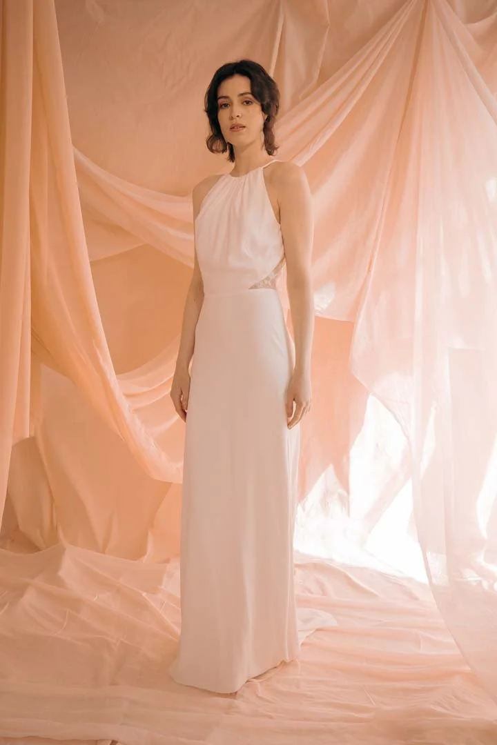 Crepe slimline gown with gathered neckline. Open back with handmade Carrickmacross lace detailing. Invisible zip back closure and covered button fastening