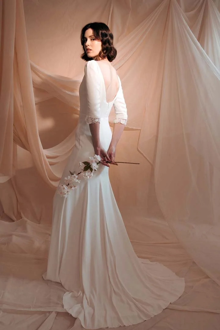 Crepe gown with square neckline and scooped low back. Handmade Clones lace detailing at sleeve ends. Internal boning in bodice. Invisible zip closure and train at back.